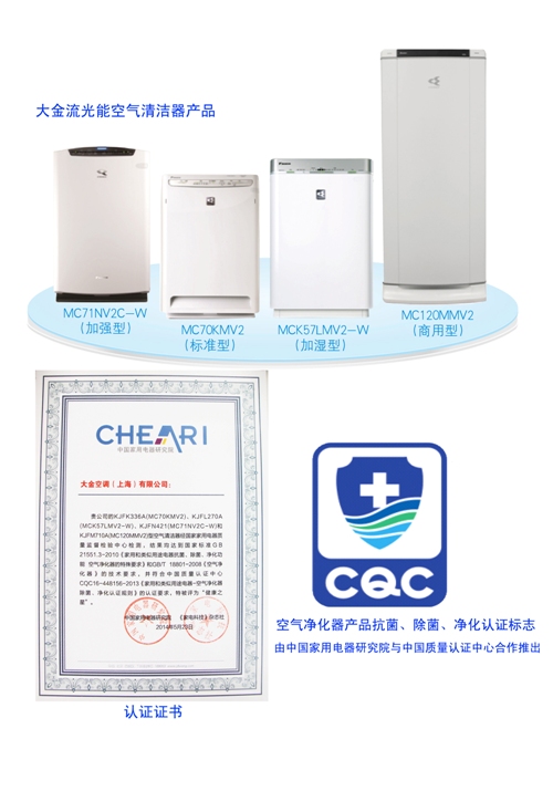 5月23日,由中国家用电器研究院与中国质量认证中心共同举办的“绿色科技 健康呼吸”——首届室内空气净化器除菌、净化认证产品发布会在北京隆重召开,大金的全系列流光能空气清洁器产品全部通过认证,并被授予了“健康之星”称号。